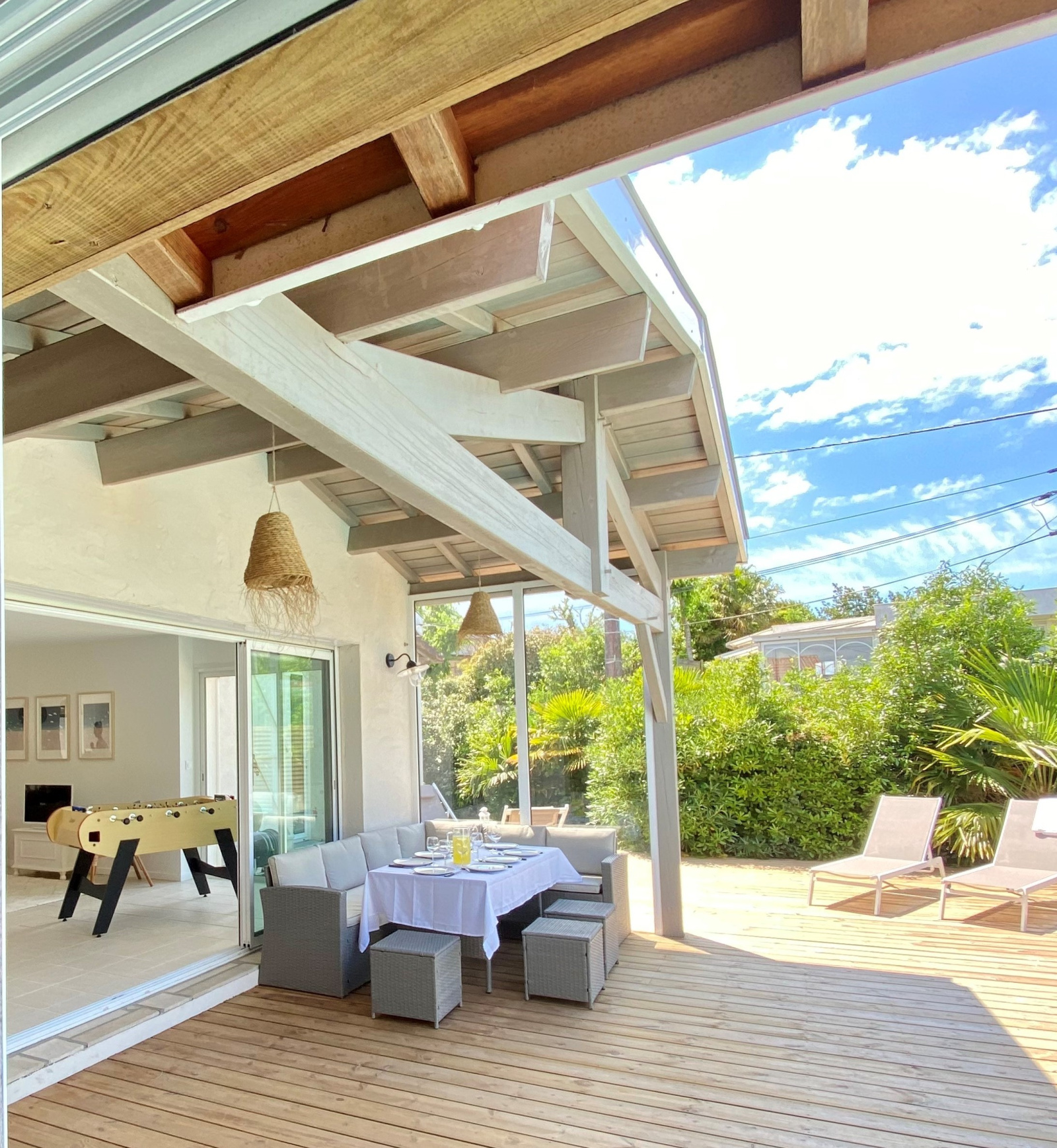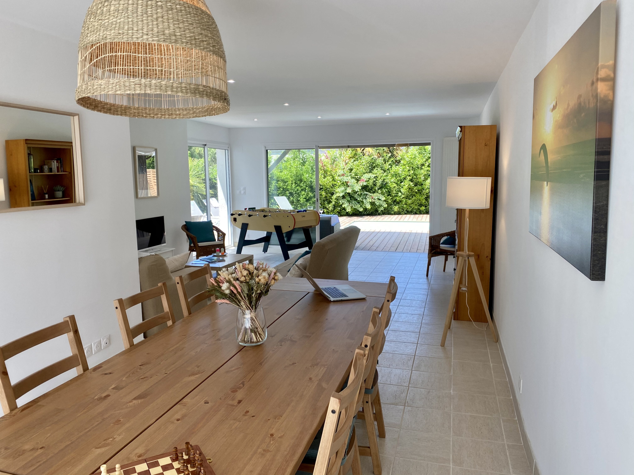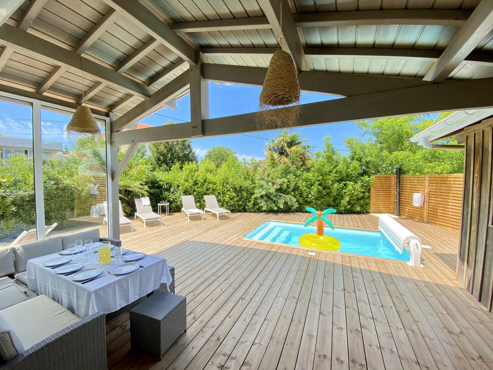 La pièce de vie, baignée de lumière, offre un accès direct à la vaste terrasse en bois entourée de végétation. Elément central de cet espace, la piscine chauffée et sécurisée, permet de profiter de l’extérieur dès l’arrivée des beaux jours. La douche solaire, très pratique au retour de plage, complète cet ensemble : rien ne manque.
