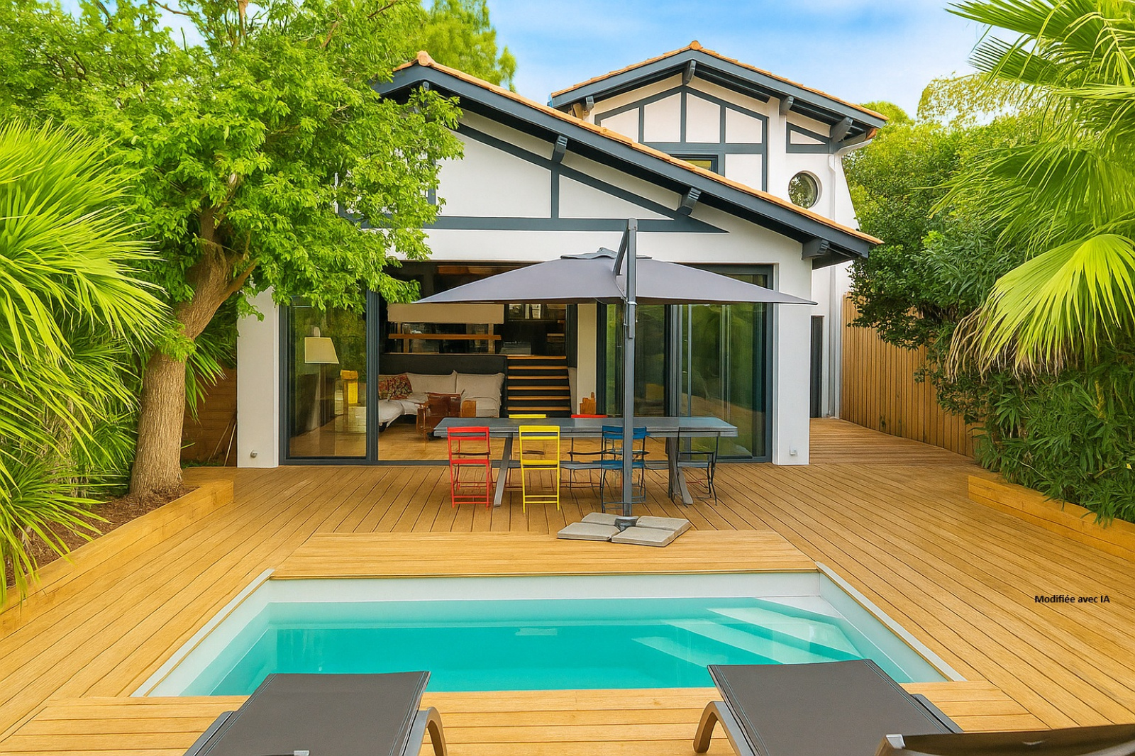 Cette villa dévoile une belle pièce de vie lumineuse, sublimée par une charpente apparente et de grandes baies vitrées s’ouvrant sur la terrasse et la piscine chauffée et sécurisée, créant une parfaite harmonie entre intérieur et extérieur.
