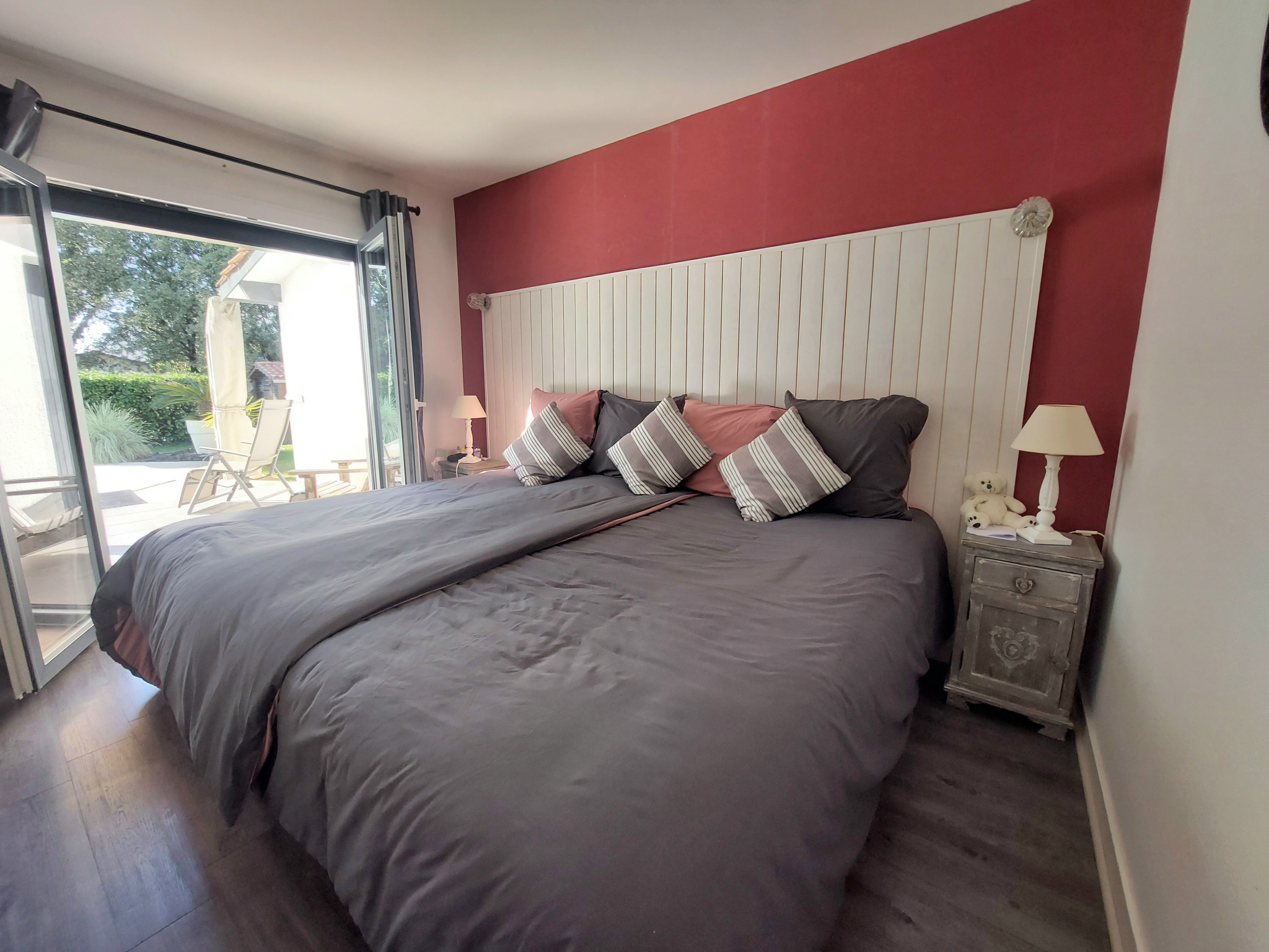 - une grande chambre donnant sur la terrasse,