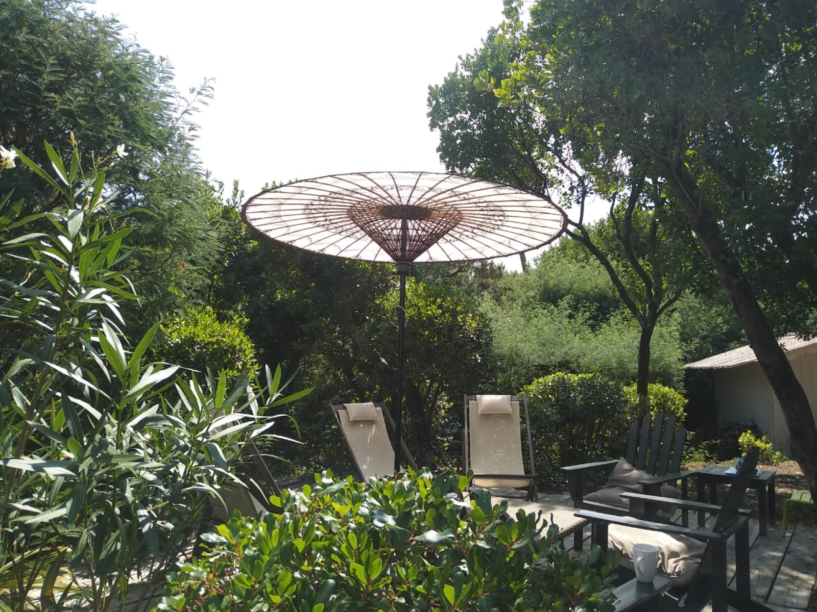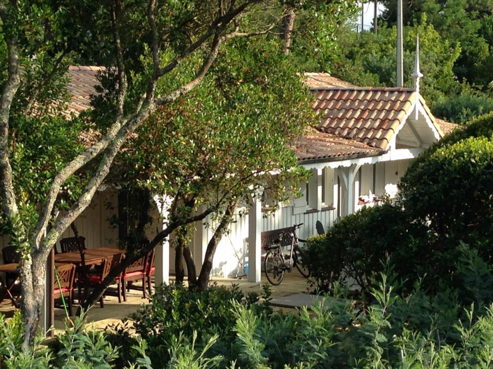Nichée sous les pins, au milieu de son jardin paysagé avec des arbres d'essences locales (pins, arbousiers, mimosas...), cette villa typique du Cap Ferret appelle à l'évasion.