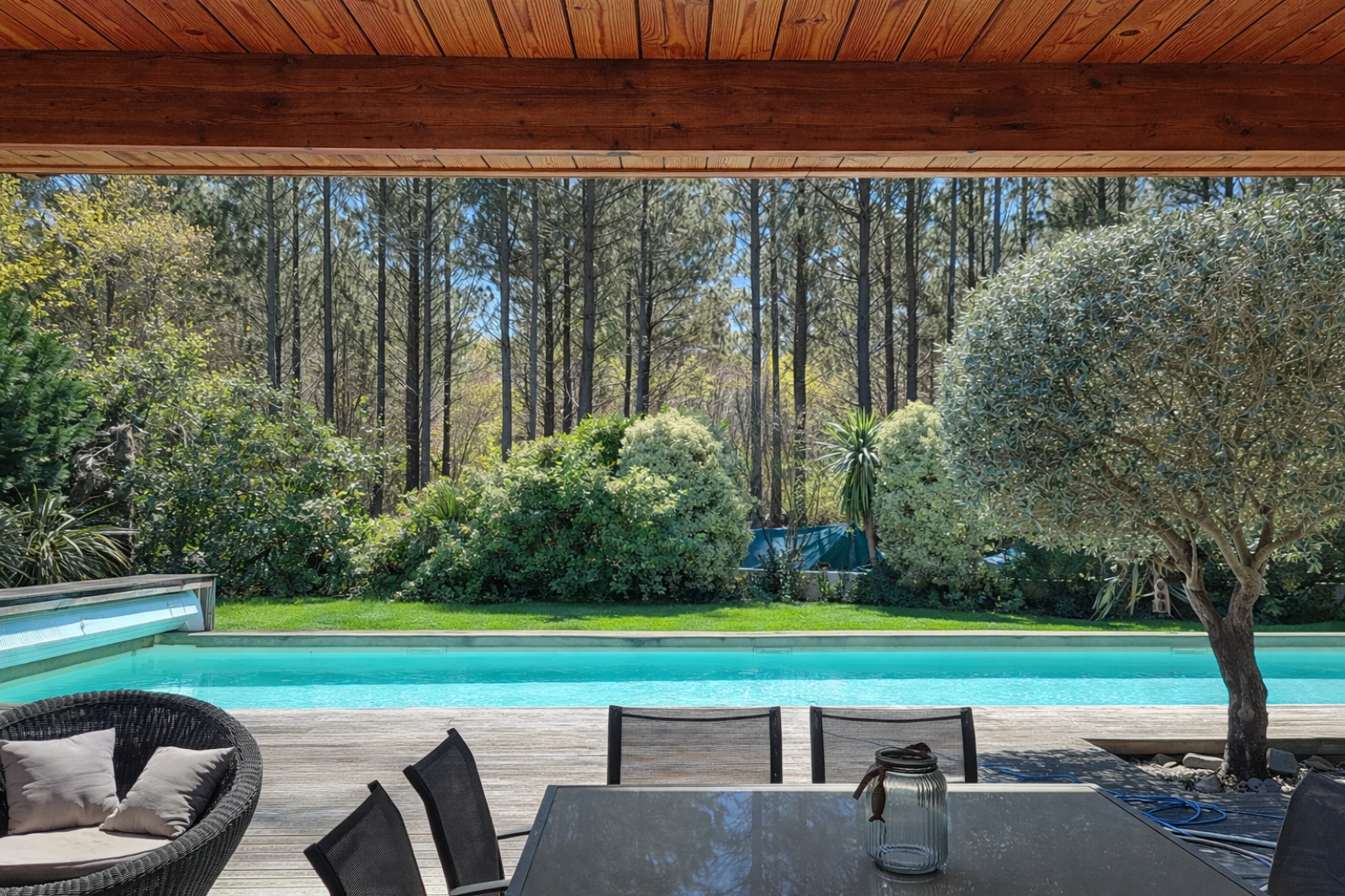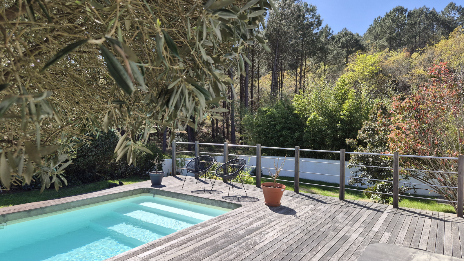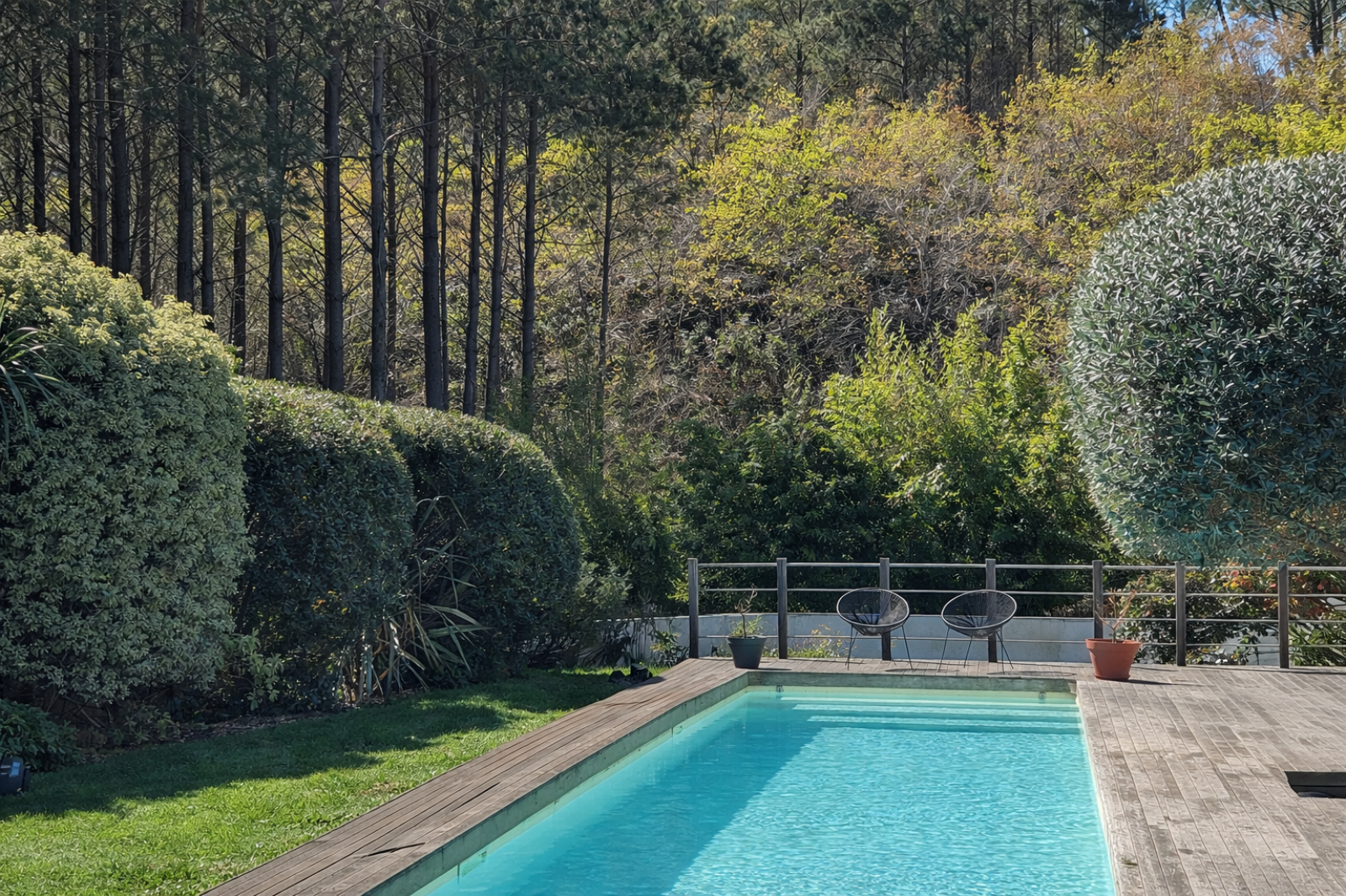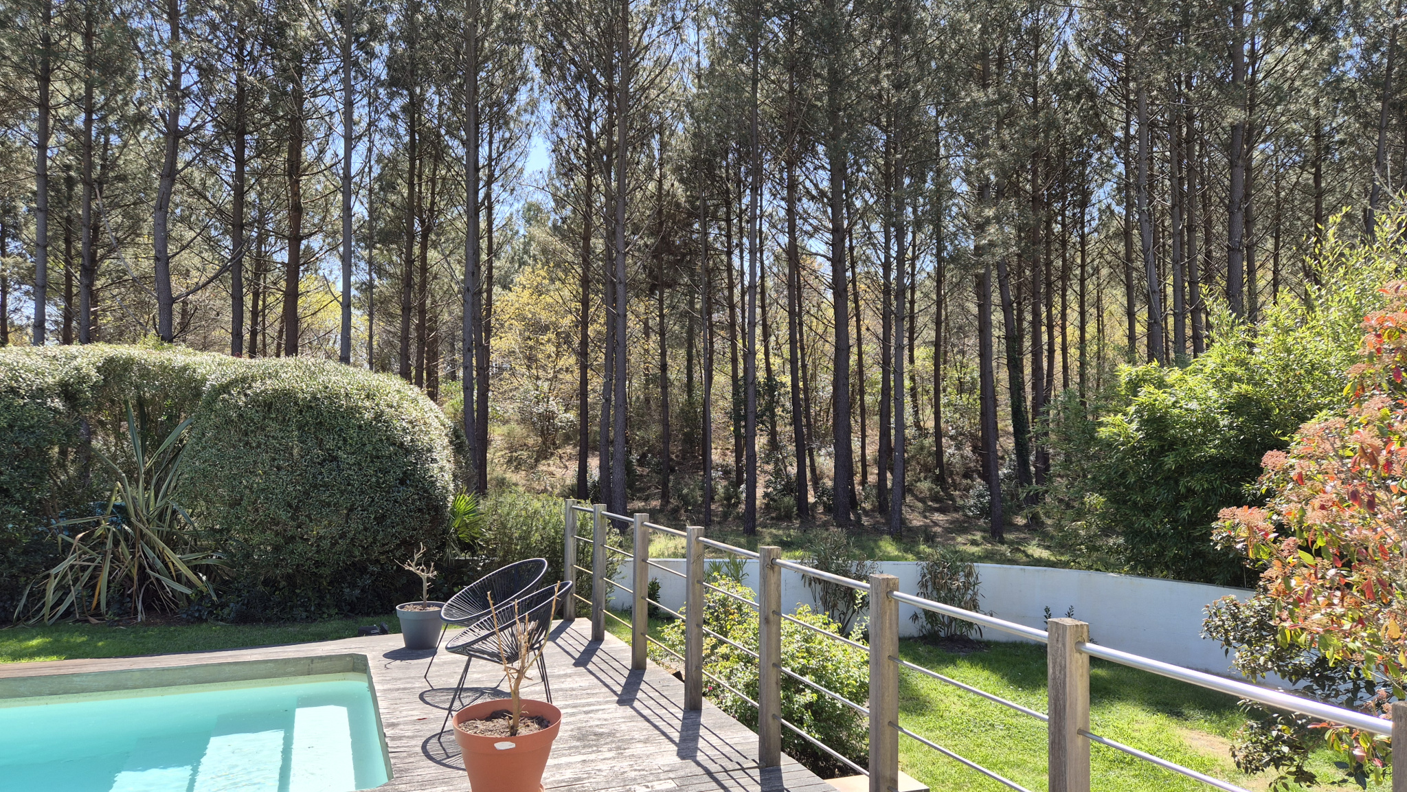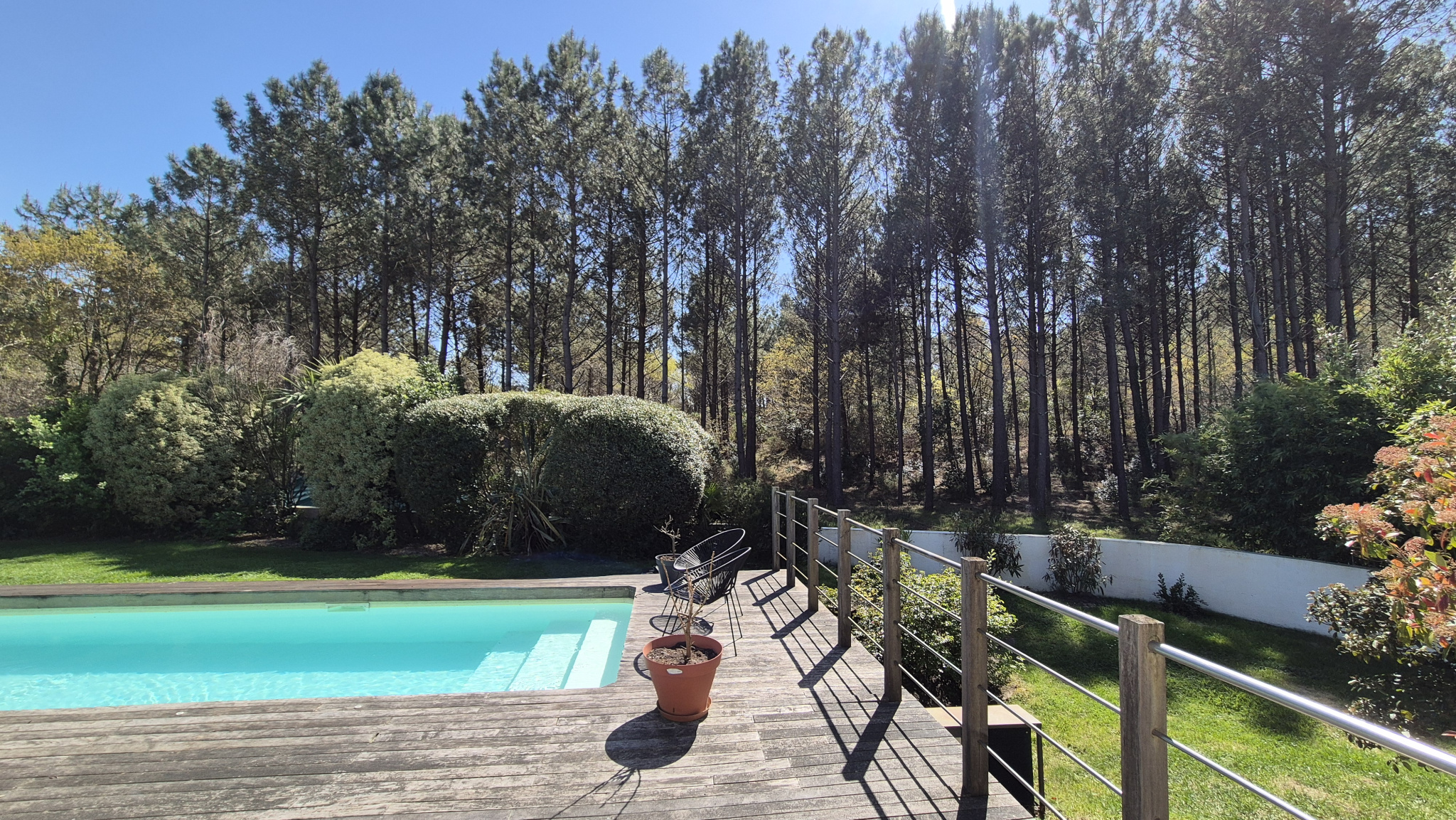 Le jardin paysager, entièrement clos et exposé plein Sud / Sud-Ouest, est un véritable havre de paix. Piscine de 3 x 15 m, terrasse ensoleillée et abritée, arrosage automatique, le tout avec la forêt en panorama … tout est réuni pour profiter pleinement de la douceur de vivre sur le Bassin, en toute saison.