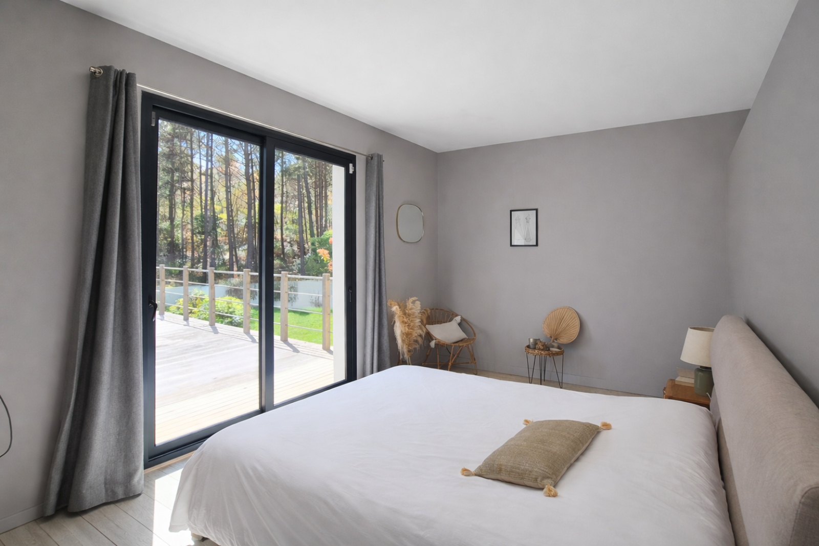 Au rez-de-chaussée, un hall d'accueil élégant donne le ton. La grande pièce de vie ouverte sur la cuisine bénéficie d'une vue directe sur la forêt — un spectacle apaisant à chaque moment de la journée. Deux ailes distinctes offrent une organisation idéale : d'un côté, une suite parentale et une suite enfant, de l'autre, deux grandes chambres et une salle de bain.