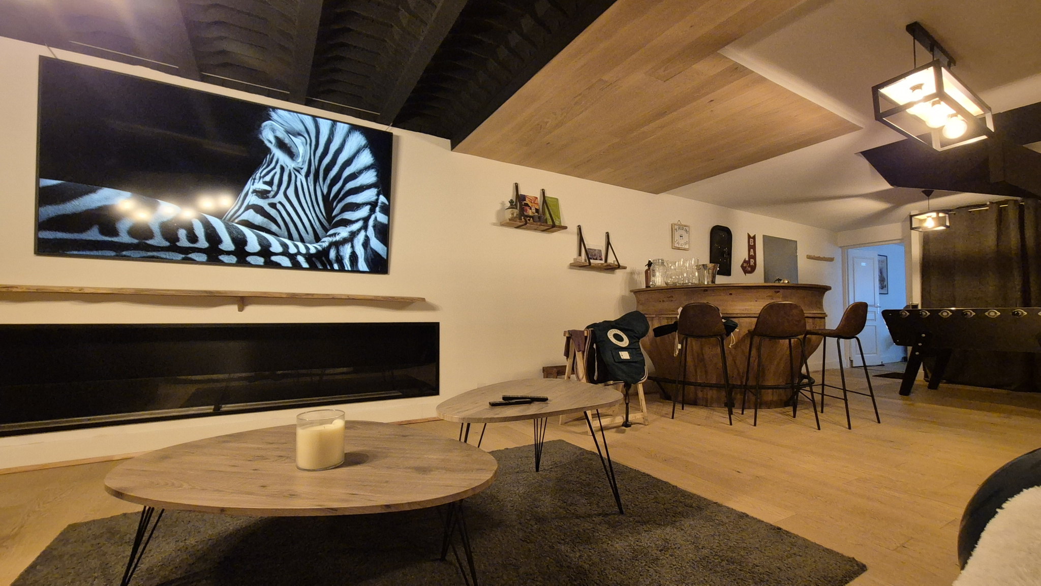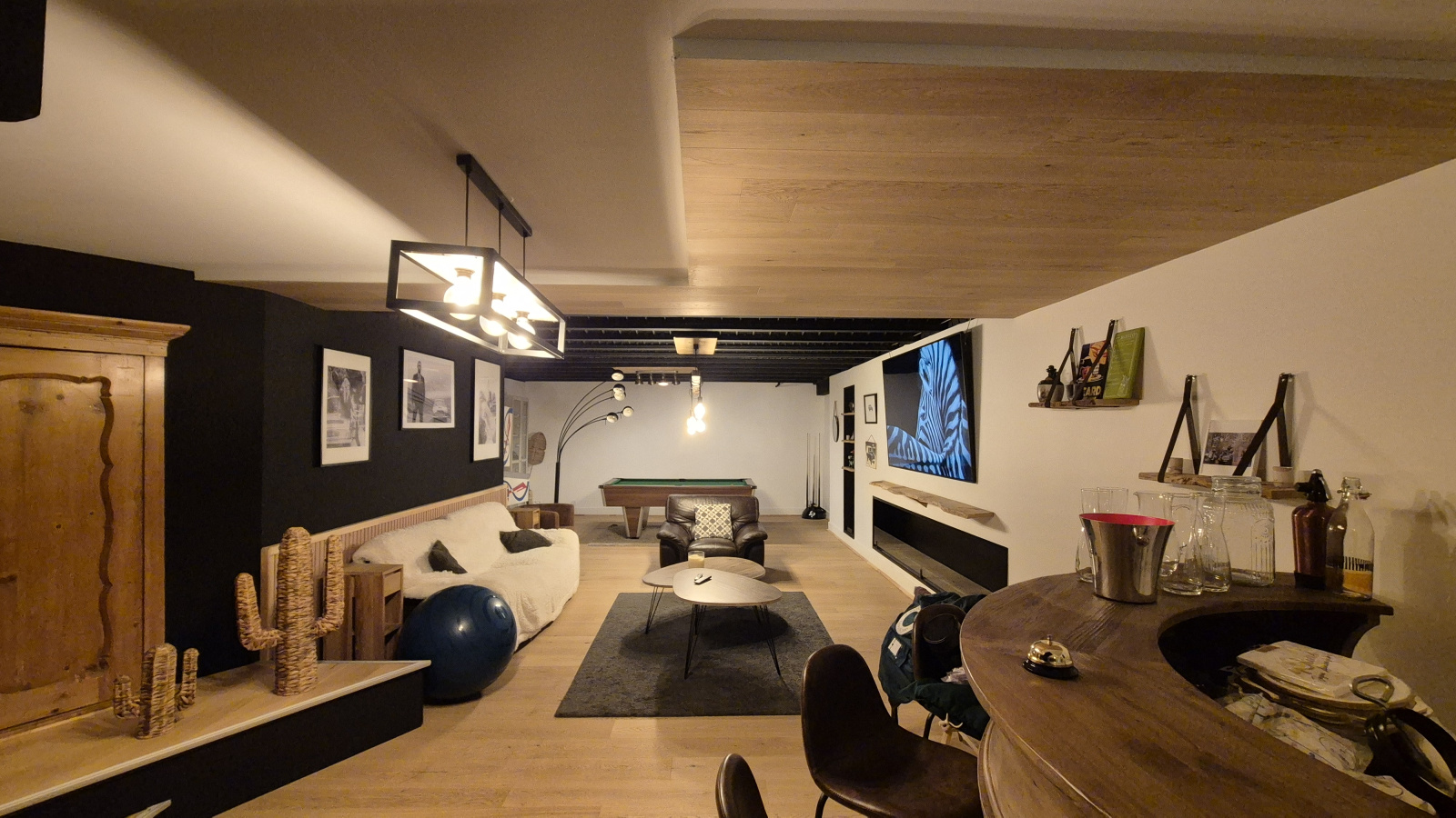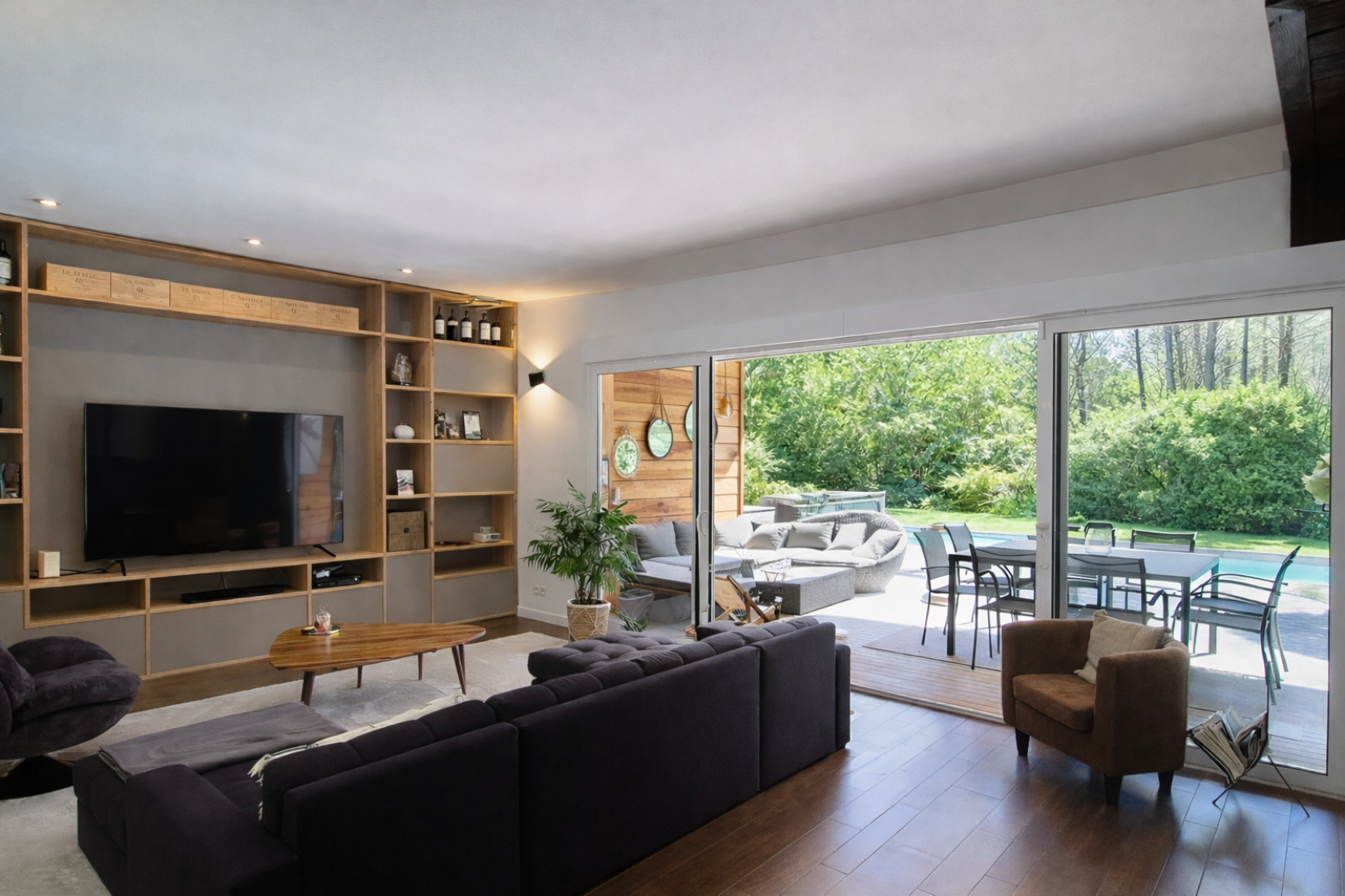 Au rez-de-jardin, l'espace de vie se prolonge avec un grand salon lounge agrémenté d'un espace cinéma / projection et un espace loisirs avec billard et baby-foot — le paradis des moments en famille ou entre amis. Une cinquième chambre, parfaitement aménageable en bureau ou cabinet libéral avec entrée indépendante, offre une vraie polyvalence. Une salle d'eau complète ce niveau.